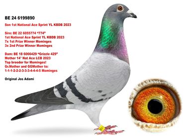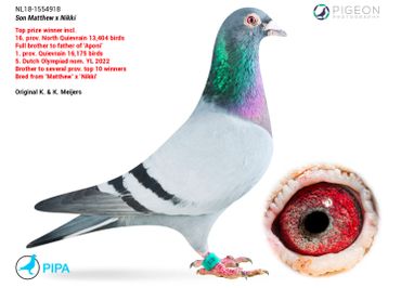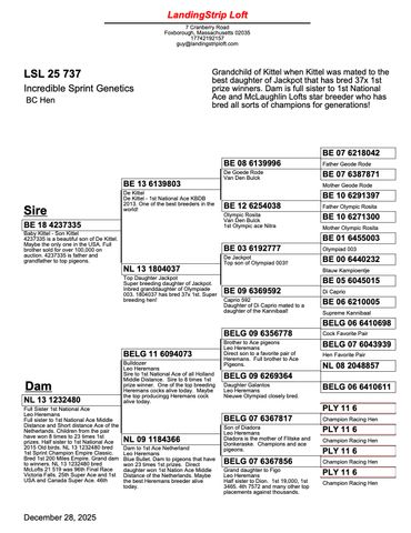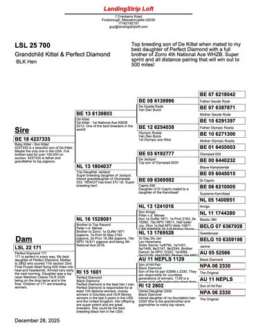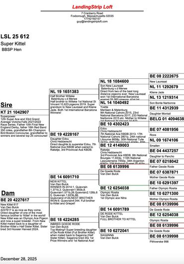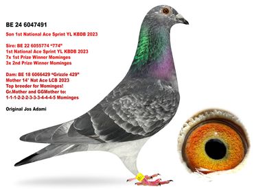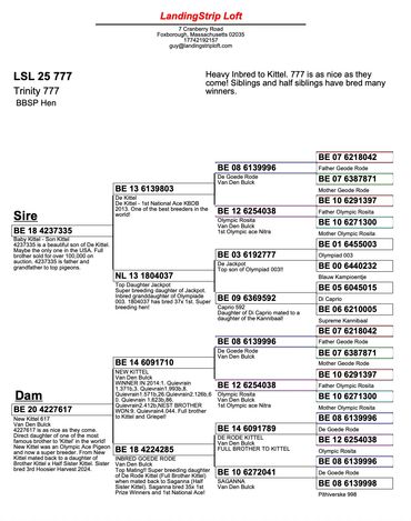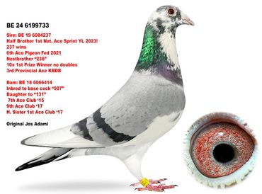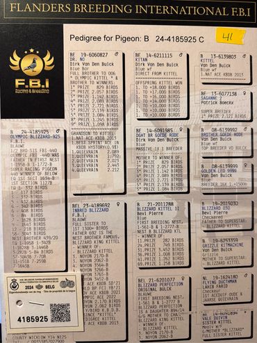 Maybe the only direct son of the world famous Kittel in North America. We are extremely proud to own him! He is super in every way. Kittel bloodlines have been dominating combine and One Loft Racing in the United States the last few years. A full sibling sold for over $100,000! We are excited to own a cock as exclusive as 4237335!