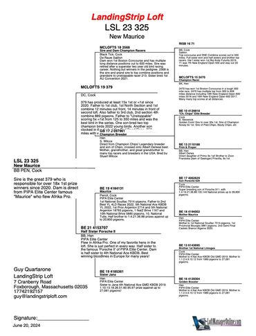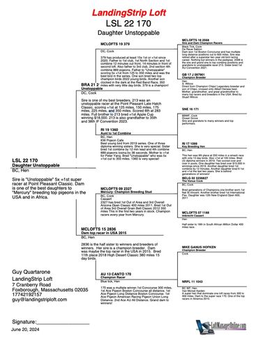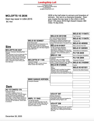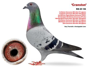 The lines of Unstoppable go back to the very best of McLaughlin Lofts. RISB 71, great grandsire to Unstoppable was a top racing cock for McLaughlin Lofts and was retired after an amazing career. Heavily inbred to the 'Dream Couple' of Sablon. For generations, the Sablon pigeons won all over the world for McLaughlin Lofts. 71 is a great grandson to the Rhone Man and also goes back to the famous Dynamo Cock.