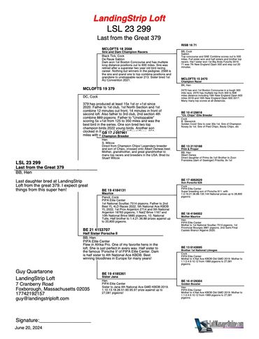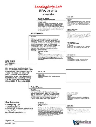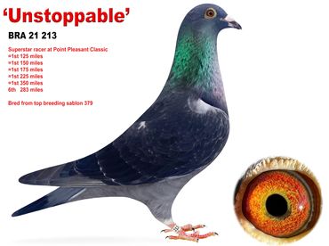 So far the Unstoppable lines show some great promise in the breeding loft. One son was 2x =1st at 175 and 350 miles. The only daughter I kept from Unstoppable in 2022 went on to breed 35th and 38th IF Convention, =1st 175 miles PPC, and 53rd Florida Derby at 200 miles vs 4,732 pigeons.